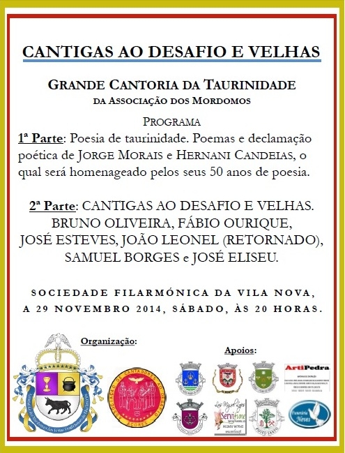 A Associação dos Mordomos da Ilha Terceira e a Associação de Cantadores ao Desafio dos Açores vão levar a cabo a “Grande Cantoria da Taurinidade”, com cantigas de improviso e velhas, que terá ludar na Sociedade Filarmónica da Vila Nova, dia 29 de novem...