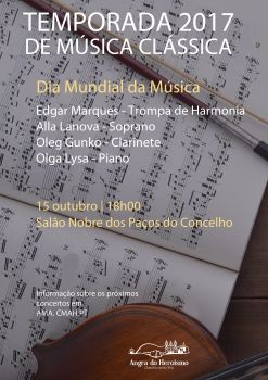 A Temporada de Música Clássica assinala o Dia Mundial da Música, dia 15 de outubro, às 18h00, no Salão Nobre dos Paços do Concelho de Angra do Heroísmo.