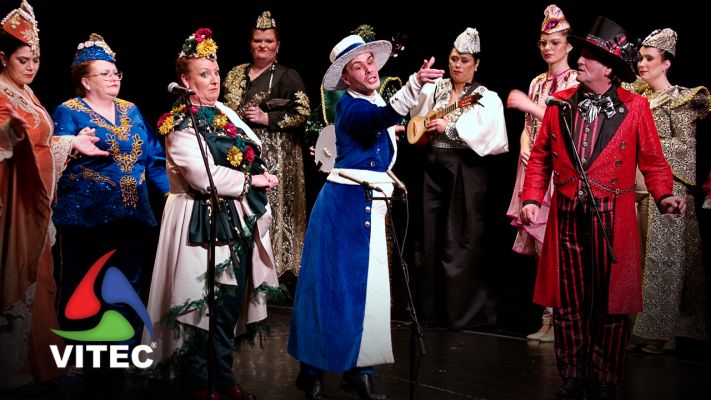 A Vitec acompanhou 47 grupos que pisaram o palco do Teatro Angrense durante o Carnaval 2026. Um deles o Bailinho de Santa Cruz com o assunto "Olha que artistas".