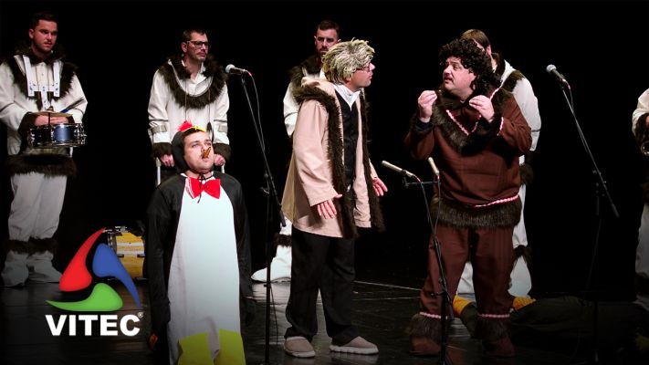 A Vitec acompanhou 47 grupos que pisaram o palco do Teatro Angrense durante o Carnaval 2026. Um deles o Bailinho dos Rapazes de Santa Bárbara com o assunto "Menos zero graus negativos".